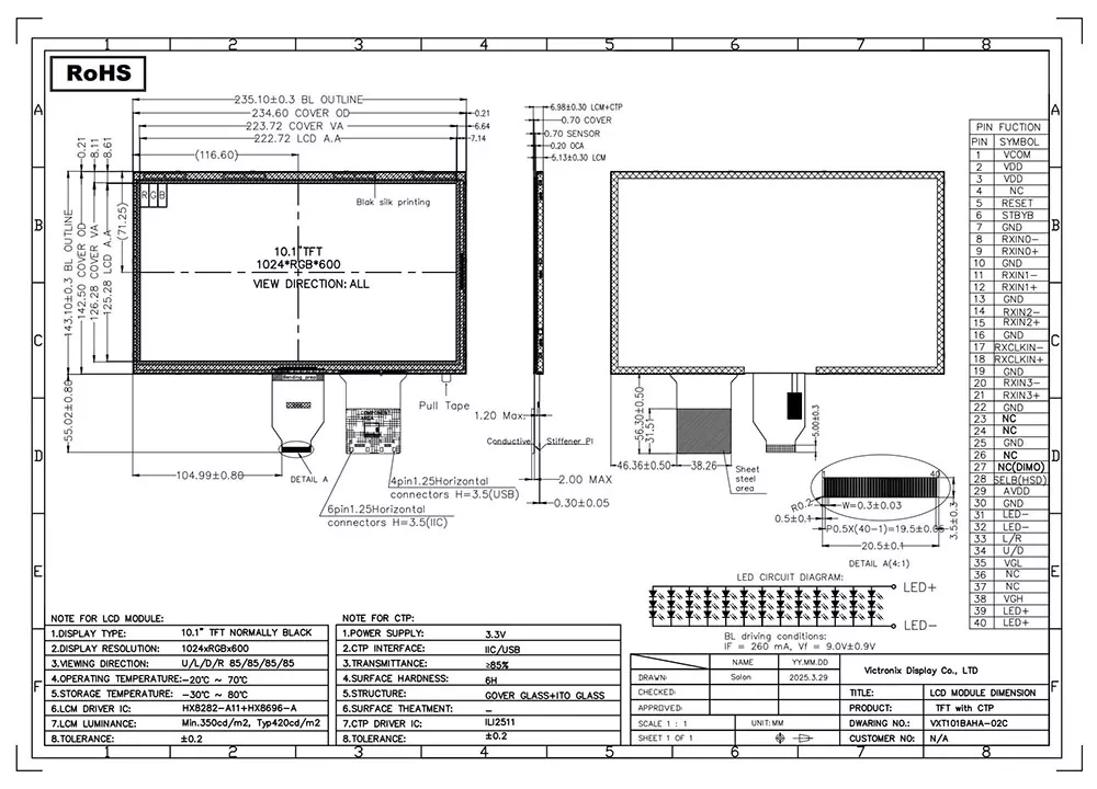 Vo veku inteligencie nám modul TFT umožňuje vizuálne prezentovať požadované údaje. Kvalita modulu TFT má kritický vplyv na jeho aplikáciu. Aké sú výhody modulu Victronix 10,1 palca 1024 × 600 LVDS TFT s CTP? Najprv jeho jas 420 CD/m², kontrastný pomer 800: 1, uhol pozorovania 80 stupňov vo všetkých smeroch a 75% uniformita zaisťujú živé snímky. Po druhé, podporuje 6/8-bitové rozhranie LVDS s ovládačom HX8282A11+HX8696A a robustným 5-bodovým kapacitným dotykovým panelom s radičom CTP ILI2511. Okrem toho je vybavený bielym podsvietením podstielky 3 × 13 s životnosťou 30 000 až 50 000 hodinami, čím sa zabezpečuje jeho dlhodobú použiteľnosť v rôznych priemyselných aplikáciách. Okrem toho je v súlade s normami ROHS a úspešne prechádza prísnymi testmi spoľahlivosti, vrátane tepelného šoku, vlhkosti a ochrany ESD až do 8 kV vzduchu a 4KV kontaktu. Tento produkt funguje efektívne pri extrémnych teplotách v rozsahu od -20 ° C do +70 ° C a vydrží vážne podmienky skladovania od -30 ° C do +80 ° C.