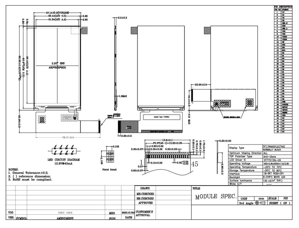 TFT LCD je typ displeja tekutých kryštálov, ktorý využíva technológiu tenko-filmových tranzistorov na zvýšenie kvality obrazu a má početné aplikácie v každodennom živote. Ako profesionálny výrobca a dodávateľ modulu TFT v Číne, čo odlišuje Victronix 3,97 palca 480 × 800 Transflection IPS TFT-LCD od ostatných výrobcov? Spočiatku ponúka typický jas 130 cd/m² a široký 85 ° uhly pozorovania (všetky smery), čím zabezpečuje vynikajúcu čitateľnosť z rôznych uhlov. Po druhé, integruje jednotku podsvietenia využívajúcu 8-dieru LED s typickou životnosťou 30 000 až 50 000 hodín (až 50% počiatočný jas), čím sa zabezpečí jasná viditeľnosť vo všetkých svetelných podmienkach. Okrem toho podporuje 18-bitovú RGB paralelnú + 3-riadkovú sériovú sériu SPI a ST7701SN-G5 radič. Okrem toho prechádza prísnym testovaním životného prostredia, vrátane prevádzky/skladovania/nízkej teploty, vlhkosti, tepelného šoku a ochrany ESD (kontakt: 4KV, vzduch: 8 kV), čo zaisťuje, že môže bezproblémovo fungovať v rozsiahlom teplotnom rozsahu (-20 ° C až +70 ° C).