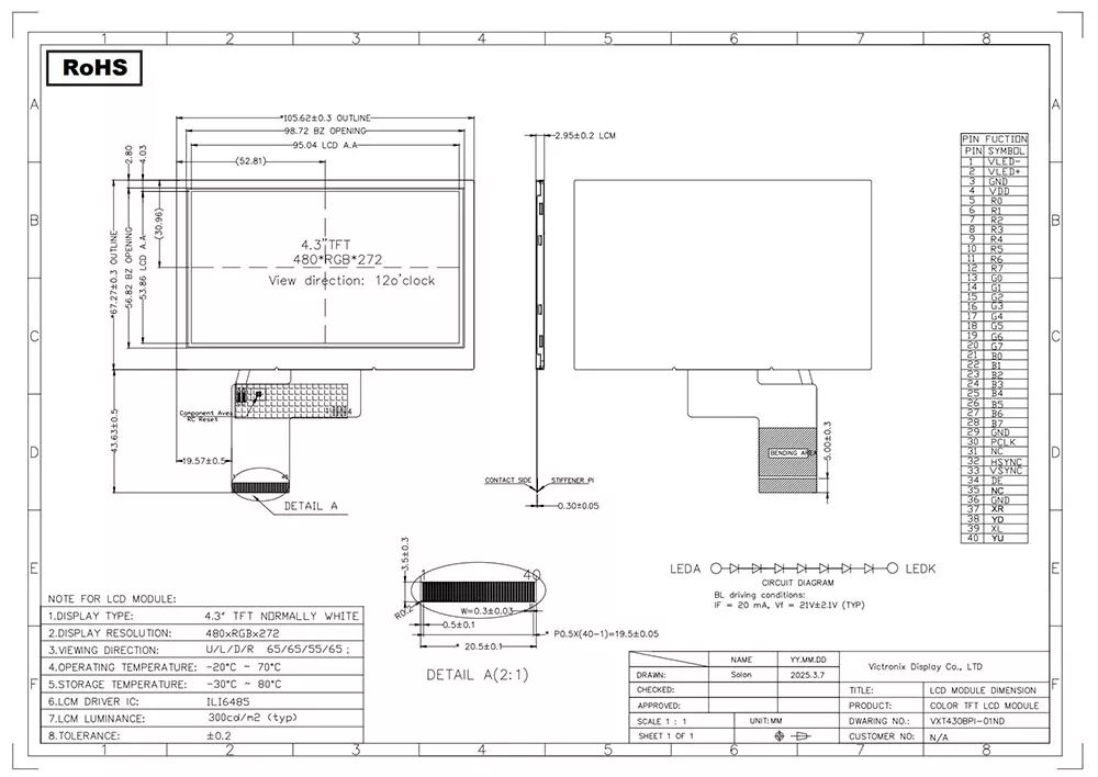 TFT LCD je typ displeja tekutých kryštálov, ktorý využíva technológiu tenko-filmových tranzistorov na zvýšenie kvality obrazu a má početné aplikácie v každodennom živote. Ako profesionálny výrobca a dodávateľ modulu TFT v Číne, čo robí priemyselný modul Victronix 4,3 palca 480 × 272 odlišný od ostatných výrobcov? Po prvé, ponúka typický jas 300 cd/m², široký pozorovací uhol 65 ° v smere 12 hodín a kontrastný pomer 700: 1, ktorý zaisťuje vynikajúcu čitateľnosť z rôznych uhlov. Po druhé, integruje jednotku podsvietenia využívajúcu 7S1p-biele LED diódy s typickou životnosťou 30 000 až 50 000 hodín (až 50% počiatočný jas), čo zaisťuje jasnú viditeľnosť vo všetkých podmienkach osvetlenia. Okrem toho podporuje rozhranie RGB s radičom ILI6485. Okrem toho prechádza dôsledným testovaním životného prostredia, vrátane tepelného šoku (-30 ° C ↔ +80 ° C cyklov), skladovania vlhkosti (60 ° C/90% RH) a mechanických vibrácií, čím sa zabezpečuje, že môže bezproblémovo fungovať v rozsiahlom teplotnom rozsahu (-20 ° C až +70 ° C).