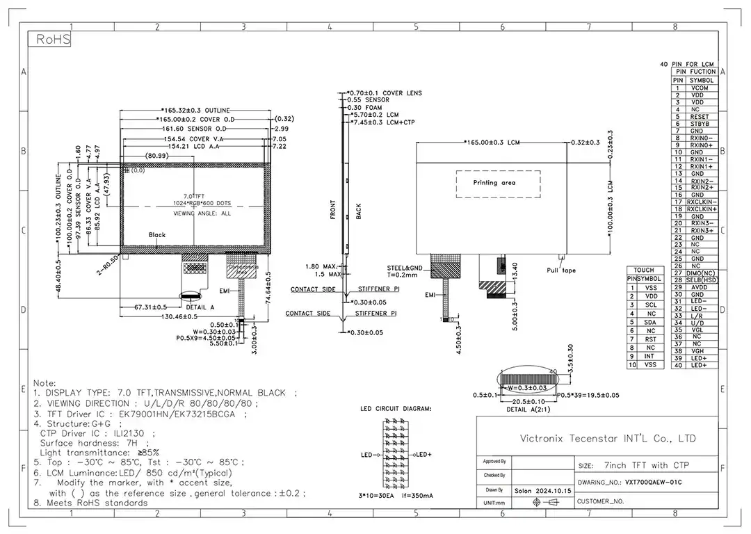Victronix je profesionálny výrobca modulov TFT a dodávateľ v Číne. V tejto oblasti sme viac ako 18 rokov. Doteraz sme vyvinuli niekoľko modelov. Tento dotykový modul Victronix 7 palcov 1024x600 TFT dotykový modul dodáva CRISP 1024 × 600 rozlíšenie prostredníctvom rozhrania RGB, navrhnutého pre spoľahlivú prevádzku v náročných teplotných prostrediach. Vďaka integrovanej funkcii dotykovej funkcie využíva robustný jednovrstvový dizajn FPC s vyhradenými komponentmi, ohýbaním a jednosmerným smerovacím zónom pre optimalizovanú efektívnosť priestoru a mechanickú odolnosť. Tento modul Victronix 7inch TFT je v súlade s environmentálnymi normami ROHS, aby sa zabezpečilo bezpečné používanie aplikácií.